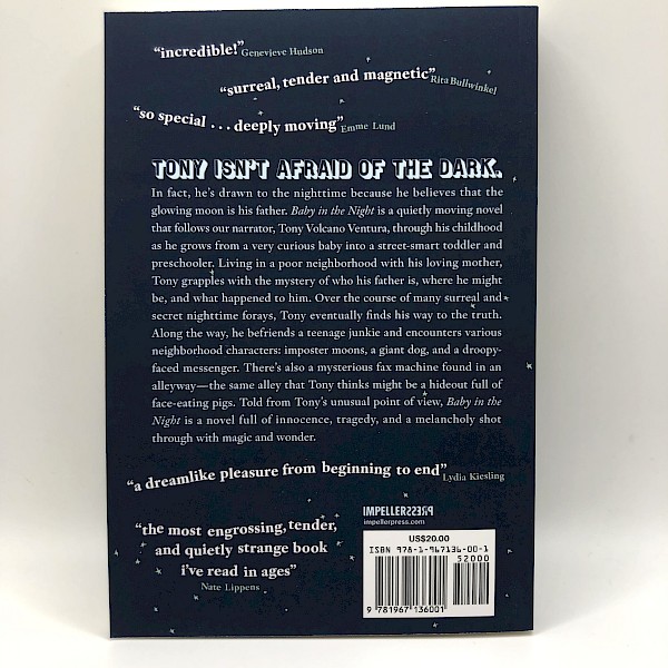 "Baby In the Night is a quietly moving novel that follows our narrator, Tony Volcano Ventura, through his childhood as he grows from a very curious baby into a street-smart toddler and preschooler. Living in a poor neighborhood with his loving mother, Tony grapples with the mystery of who his father is, where he might be, and what happened to him. Over the course of many surreal and secret nighttime forays, Tony eventually finds his way to the truth. Along the way, he befriends a teenage junkie and encounters various neighborhood characters: imposter moons, a giant dog, and a droopy-faced messenger. There’s also a mysterious fax machine found in an alleyway—the same alley that Tony thinks might be a hideout full of face-eating pigs. Told from Tony’s unusual point of view, Baby In the Night is a novel full of innocence, tragedy, and a melancholy shot through with magic and wonder."