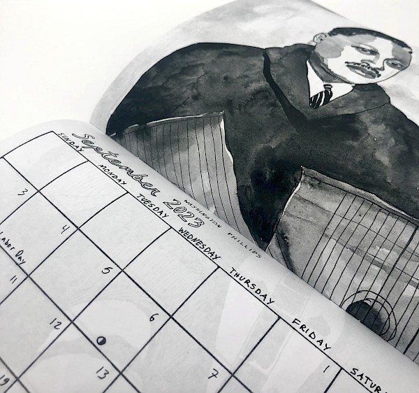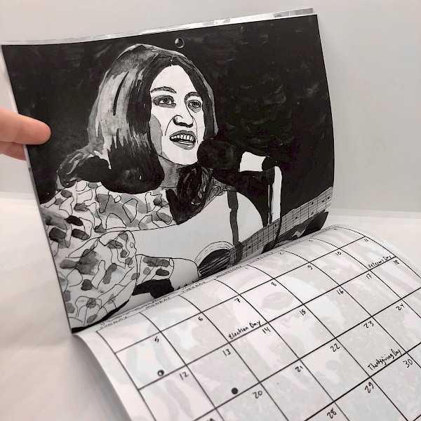 Black & white, hole-punched. With major holidays, phases of the moon, and a page for notes. 7.5" x 14" when unfolded. Limited edition!