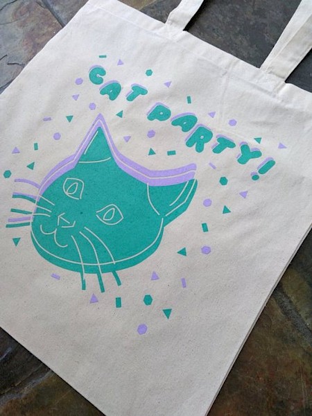The excitement of a party with cats. On a tote. Designed by Katie Haegele of Cat Party zine and Joseph Carlough of Displaced Snail Publications.
