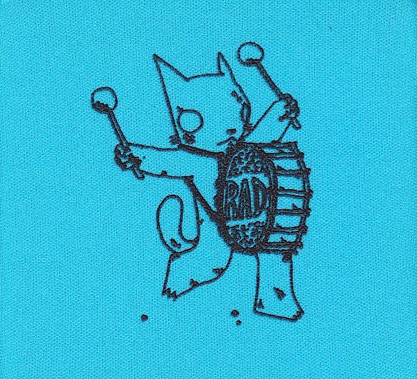 A drummer cat beer koozie with a marching band drum that says, "Rad."