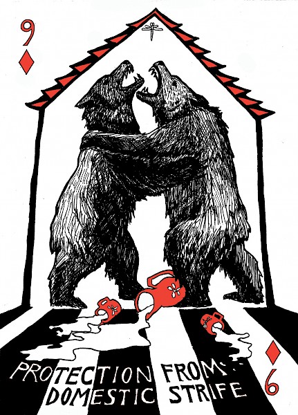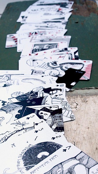 "For uses both serious and frivolous: 54 illustrated playing cards, each imbued with the power to protect you from some common calamity."
