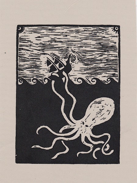 From the depths. A mythological sea battle, on a patch.