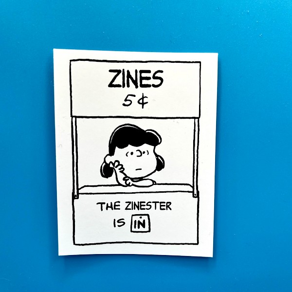 A sticker every zine lover and maker should own. Featuring Lucy of Peanuts, at her lemonade stand-styled therapy office, offering her zine services (and notably cheap zines).
