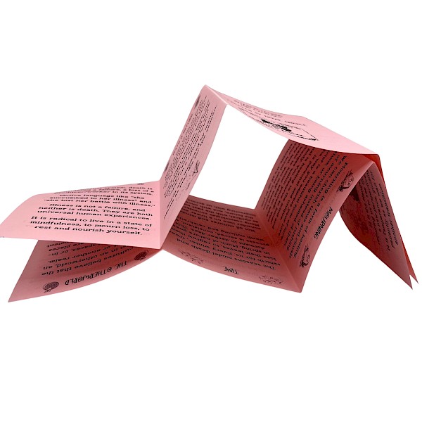 16-page single-sheet mini zine, includes color accents, cover colors vary.