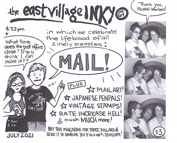 Get ready for all manners of charm, play, and quirk as the long-running East Village Inky zine delves into the subject of snail mail. What comes out is a mini memoir told through stories about letters and postcards, '90s zines, sleepaway camp, stamp collecting, penpals, and mail art. There's also a how-to on lowering your postal expenses, reviews of epistolary novels, a playlist of mail-related songs, and a postal carriers hall of fame. Wow! So much.