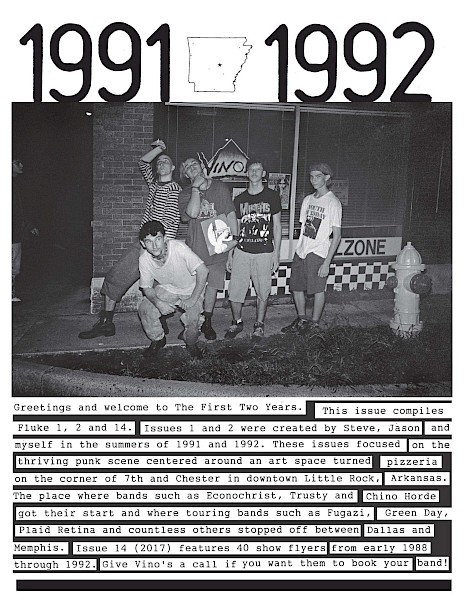 One of the longest running zines around, Fluke, collects their first two years of issues and allows us to time travel back to 1991 and 1992. Through it, we get a peek into the state of punk from the perspective of some kids in Little Rock, Arkansas. They interview Fugazi, Lungfish, Plaid Retina, pack in a ton of rad fliers, and give us some reflections from today.
