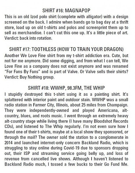 This time Aj digs through the box of shirts that were slated to become a quilt, or be donated, and wears one each to try to understand why these shirts had been relegated to the box to begin with. What emerges is a nice peek into '80s and '90s punk and indie rock, 2000s comic culture, underground movies, and more.