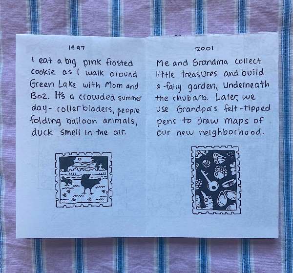 A series of memories brought on by a trip home, each accompanied by postage stamp-sized drawings from the natural wonders of Washington state.