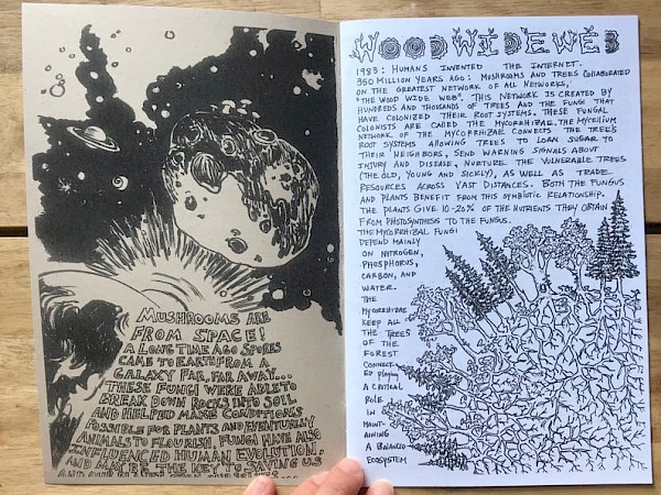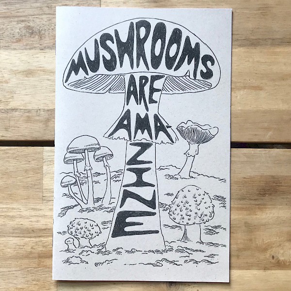 In this fungi-focused zine: medicinal mushrooms, mushroom tea, mushroom hunting, psilocybin, cordyceps, the mycelial web, and a really handy and lovely center spread of common mushrooms.