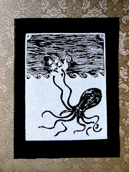 From the depths. A mythological sea battle, on a patch.