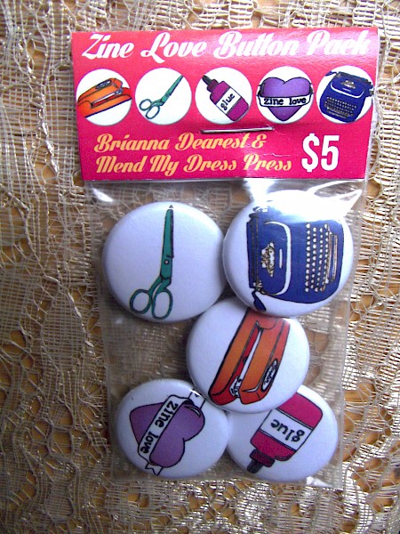 Five one inch buttons to show off your zine love. Represented within: Typewriter, glue, scissors, stapler, and zine heart tattoo. Ridiculously cute. Drawings by Bri Dearest of Motor City Kitty.