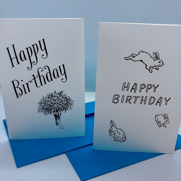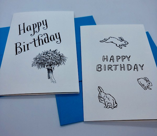 4” x 6” folded cards, blank inside, professionally printed at Community Printers on high-quality recycled 80 lb. card stock, includes blue size-A6 envelopes.