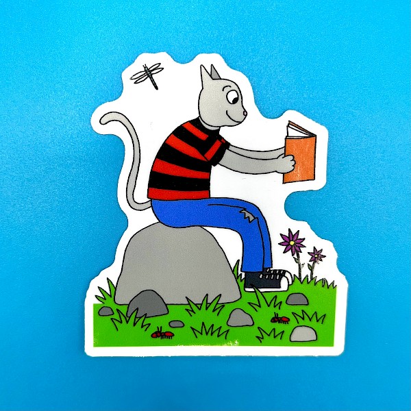 A cat, sitting on a rock, reading a zine. (As seen on the cover of the Questions & Answers zine!)
