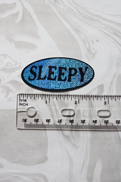 2.5" wide x 1.2" tall, waterproof, oval blue-glitter sticker with black text and border.