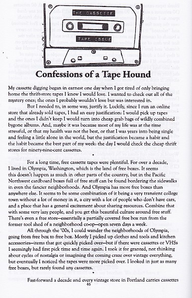 A zine in tribute to a maligned beauty of pop culture's past: the compact cassette tape. Twenty writers, musicians, DJs, label owners, publishers, and comic artists tell stories of how cassette tapes have affected their lives, for better or worse.