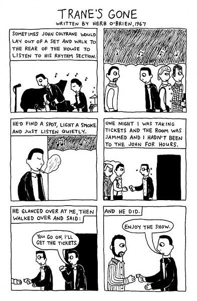 A highly enjoyable series of comics adapted from music biographies. Within: Bob Dylan's makeshift Blood on the Tracks backing band, Kurt & Courtney's mac-and-cheese trials, John & Yoko's primal scream therapy, John Coltrane being a good guy, Mike Watt wearing a pumpkin on his head, the feuds of J Mascis & Lou Barlow, and Kristin Hersh's evil self.