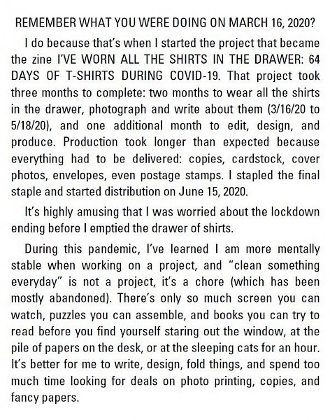 The sequel to Aj Michel's COVID t-shirt zine project, I've Worn All the Shirts in the Drawer, Got a Box Full of T-Shirts is another charming daily project in an effort to stay sane through a global pandemic.