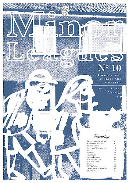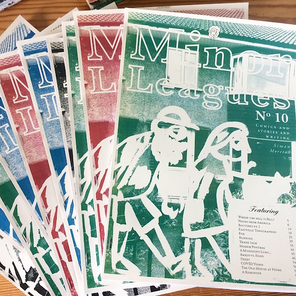 We always love Minor Leagues, U.K. comic artist/graphic memoirist Simon Moreton's ongoing zine series. Dreamy fluid comic art, solid prose, collaged bits and pieces, a fun variety show of a zine. In this issue: notes from America, birdwatching, topographies, wallpaper, foxes, home.