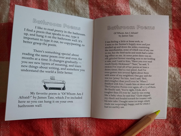 20 pages, stapled wraps, quarter-size/pamphlet size (4.25" x 5.5", 108 mm x 140 mm).